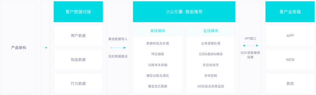其中,智能推荐是基于字节跳动大规模机器学习和个性化推荐技术为客户提供的服务,不仅在信息资讯、视频直播、电商等多个场景中沉淀了大量经验,而且在今日头条、抖音等产品上得到了成功验证。同时,该服务可以针对客户个性化的场景需求,提供定制化服务,并承诺对效果负责。