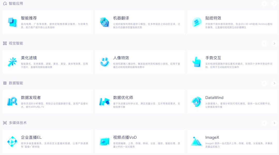 二、火山引擎的产品线很丰富,覆盖了视觉智能、数据智能、多媒体技术、智能推荐等多个方向,未来我们还会有更多技术产品和解决方案推出。这些产品,能够在各个业务场景上支撑企业的全面增长。