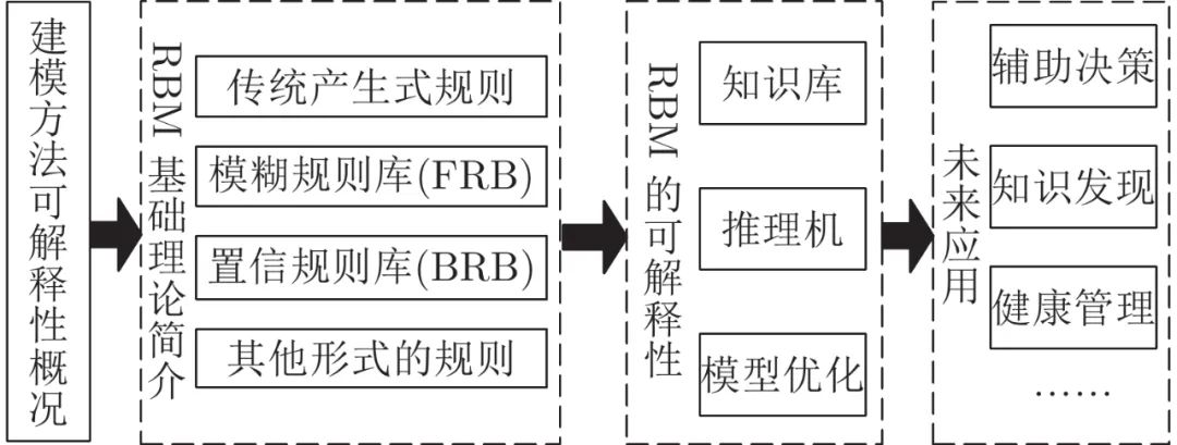 RBM的优势在于其内置的可解释性, 本文的“可解释性” 侧重于说明如何建立和保持RBM的内置可解释性, 即如何在构建知识库时获得可解释性, 如何保证推理过程的透明可解释, 如何在优化过程中保持可解释性. RBM的可解释性主要取决于几个因素, 包括模型结构、规则数目、模糊集的形状等[8, 10, 45]. Zhou等结合前人的研究从模糊集和模糊规则层面将FRB的可解释性分为低级可解释性(Low-level interpretability)和高级可解释性(High-level interpretability)[10]. 然而, 随着模糊规则被拓展为置信规则, 高低级可解释性在描述BRB系统的可解释性方面存在一定的局限性. 本文主要对RBM的发展进行概述, 从知识库、推理机、模型优化等角度分析总结典型文献中关于其可解释性的研究, 并在此基础上对其未来发展进行了阐述, 旨在为RBM的发展和改进提供一定的参考和借鉴. 本文的整体框架如图 1 所示.