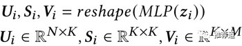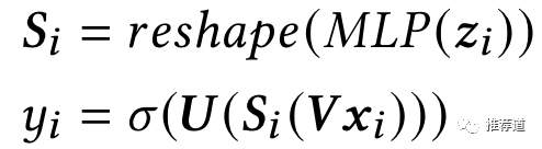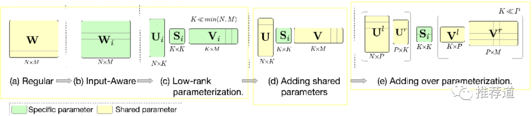 根据“场景敏感”特征动态生成的不再是一个大矩阵,而是三个小矩阵矩阵。理论上这三个小矩阵相乘的结果就等于原来的大矩阵,但是K << min(N,M)