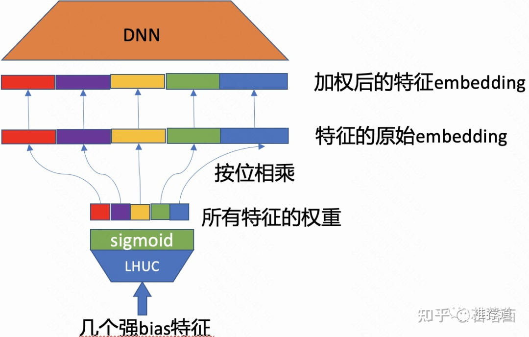 强bias特征作为SENet或LHUC(Learn Hidden Unit Contribution)的输入,经过sigmiod激活函数后,输出是一个N维度向量,N是所有field的个数