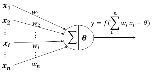 一个神经元有n个输入,每一个输入对应一个权值w,神经元内会对输入与权重做乘法后求和,求和的结果与偏置做差,最终将结果放入激活函数中,由激活函数给出最后的输出,输出往往是二进制的,0 状态代表抑制,1 状态代表激活。