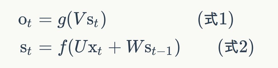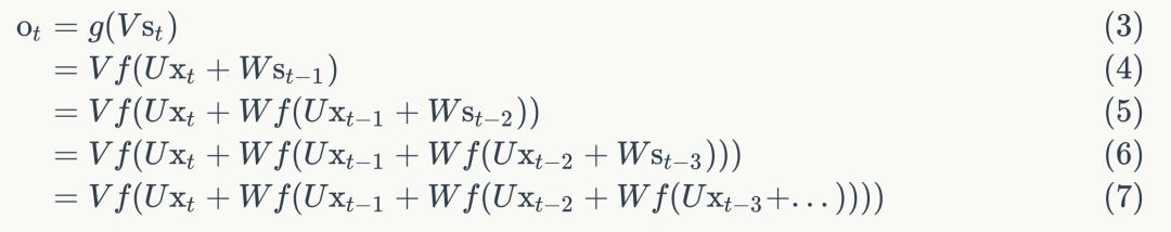 式1是输出层的计算公式,输出层是一个全连接层,也就是它的每个节点都和隐藏层的每个节点相连。V是输出层的权重矩阵,g是激活函数。式2是隐藏层的计算公式,它是循环层。U是输入x的权重矩阵,W是上一次的值St-1作为这一次的输入的权重矩阵,f是激活函数。