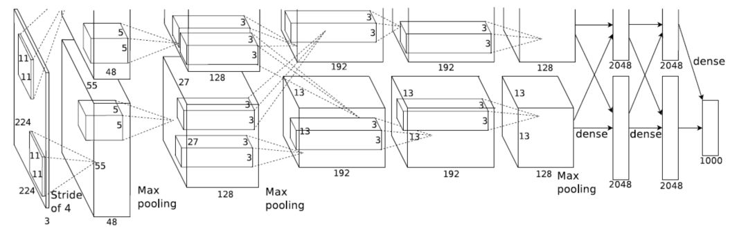 ·第一层卷积:11×11大小的卷积核96个,每个GPU上48个。