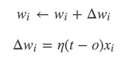我们会从随机的权值开始,反复地应用这个感知机到每个训练样例,只要它误分类样例就修改感知机的权值。重复这个过程,直到感知机正确分类所有的样例。每一步根据感知机训练法则来修改权值,也就是修改与输入 xi 对应的权 wi,法则如下: