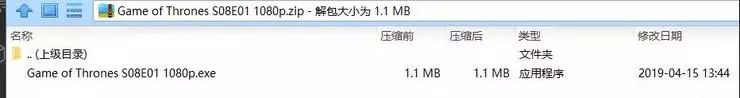 更有甚者,会通过利用“权力的游戏”第一集1080P高清版本去进行钓鱼攻击,从下图压缩包可见,很明显是一个带exe的恶意软件,而实际上不小心的用户往往会点击,从而感染病毒。