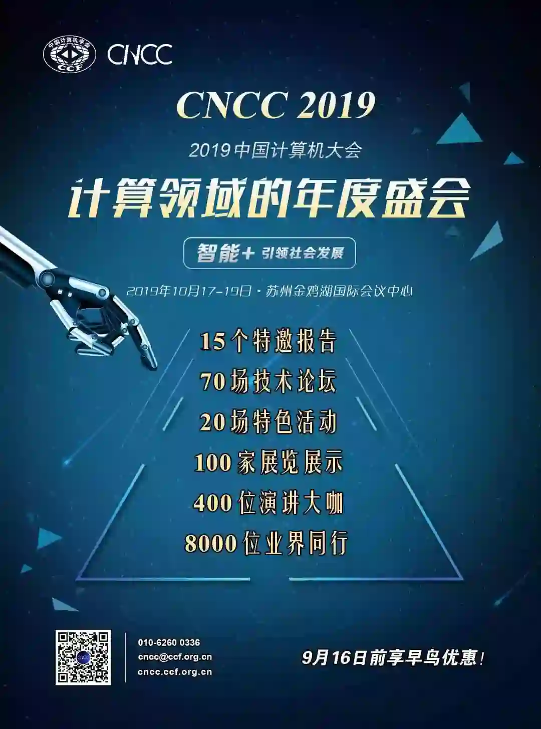 由CCF主办的CNCC2019(2019中国计算机大会)将于10月17-19日在苏州金鸡湖国际会议中心举行,CNCC具有规格高、规模大、内容丰富的特点,已经成为计算领域影响力最大的年度盛会,每年都吸引大量专业人士参会,通过CNCC快速了解国内外学术、产业发展进展,结识同行,收获满满。