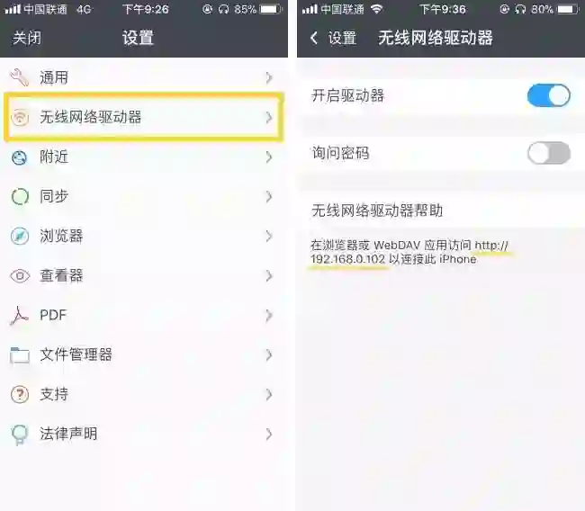 Documents 其实还有一项非常实用的局域网文件共享功能。在设置界面中进入「无线网络驱动器」,开启驱动器开关后,只要在同一局域网环境下(比如同一 Wifi )使用浏览器或者支持 WebDAV 的应用内访问指定链接网址,任何设备都能连接并读取 Documents 内的内容。