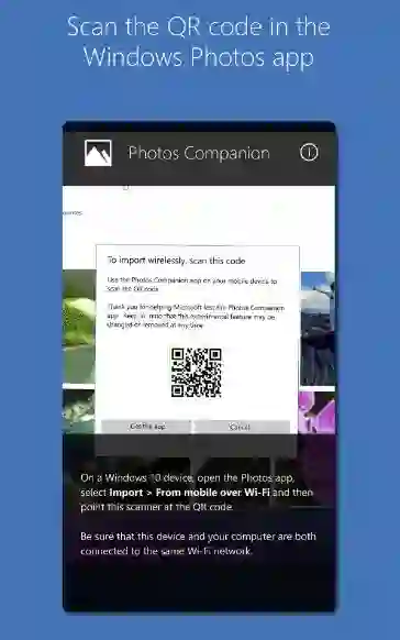 不过由于这项功能目前处于预览版测试,默认没有开启,你需要先在「照片」应用中找到「设置」,然后打开「预览」下「帮助 Microsoft 测试通过 WLAN 进行移动导入的功能」,照片应用的「导入」菜单中就会出现选项「通过 WLAN 从移动设备导入」了,点击后用移动端 App 扫描二维码即可完成配对进行传输了。