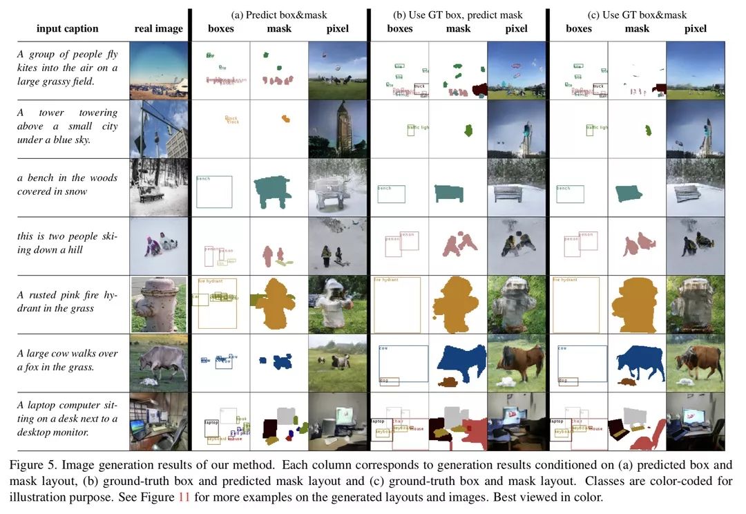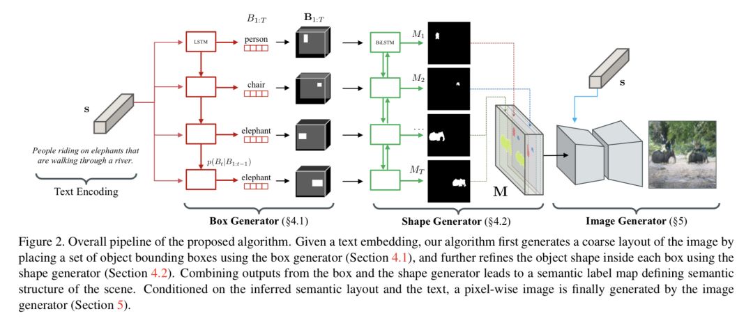 本文是密歇根大学和 Google Brain 发表于 CVPR 2018 的工作,论文首先从文字用一个 box generator 预测出物体类别所在的 bounding box 的位置,然后用 shape generator 在 box 的基础上生成更细腻的 mask,最后把 mask 和文字信息输送到 image generator 进行图片的生成。