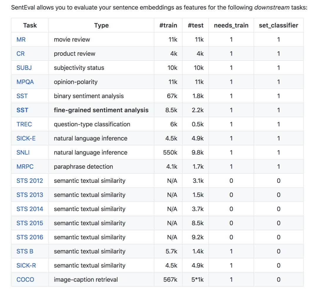 SentEval 是 Facebook AI Research 推出的一个用于测评 Sentence representation model 性能的 framework。其中自定义了至少 13 个任务(后续有添加),任务数据包括了文本文类,文本相似性检测,NLI,图片摘要的任务。其着眼点是目前 NLP 领域内不同模型的跑分不能很好的进行复现,进而导致横向比较模型性能比较困难的痛点。