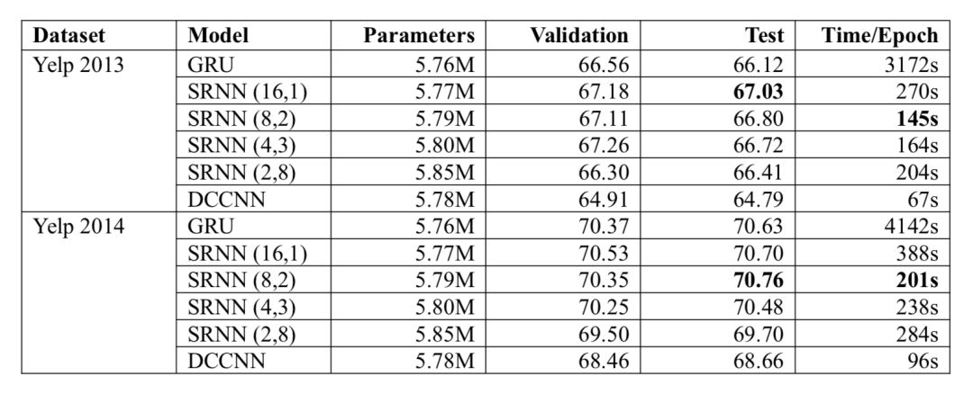 SRNN 把 RNN 序列分成每份 K 份,这样每份可以各自运行(并行),得到长度为 N 的新序列,后续可以新序列上继续如上操作,一直到序列长度等于 1 或满足需求。通过在 6 个较大规模的情感分类数据集上测试,相比于 RNN,SRNN 都取得很大的性能优势。