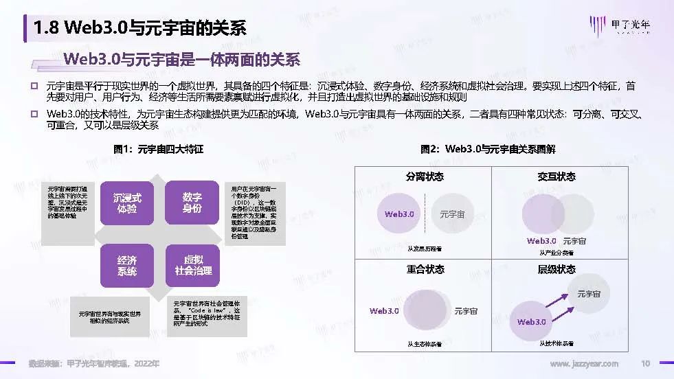Web3.0的技术特性,为元宇宙生态构建提供更为匹配的环境,Web3.0与元宇宙具有一体两面的关系,二者具有四种常见状态:可分离、可交叉、可重合,又可以是层级关系