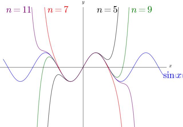 从图中可以看到,泰勒级数在 之间收敛。超出这个范围,泰勒级数的图像就远离原函数的图像。