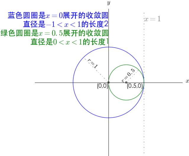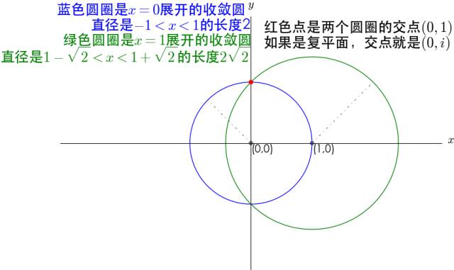 对比这两个展开的收敛区间,看不出什么规律来,同样的画下收敛圆看看: