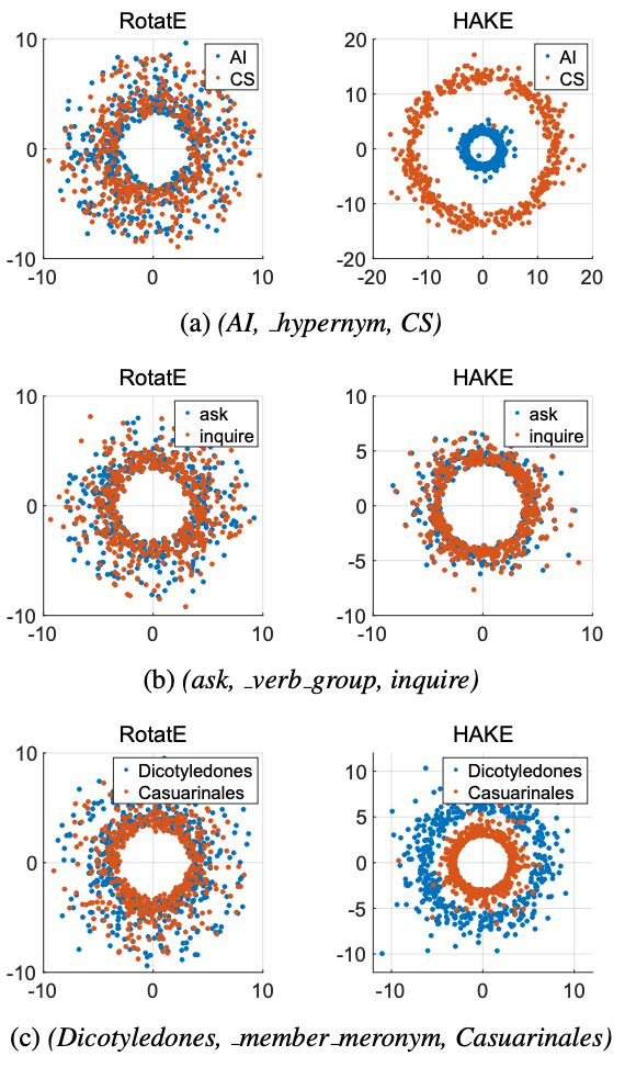 我们接下来对实体进行可视化分析。在这部分的实验中,为了更加清晰的展示出通过 HAKE 建模得到的分层效果,我们将 HAKE 与 RotatE 进行对比,将两种模型得到的实体向量的不同维度都绘制成同一个二维平面上的点。我们从 WN18RR 中选取了三个不同类型的三元组,得到如下的散点图。