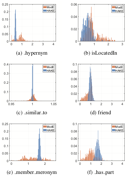 为了验证上述猜想,我们进行了如下实验分析。首先,我们从三个数据集中选取了一些代表性的关系。接着,对于这些关系在 ModE 与 HAKE 模型中的模长部分向量,我们绘制了每一维度的取值的分布直方图,如下图所示:
