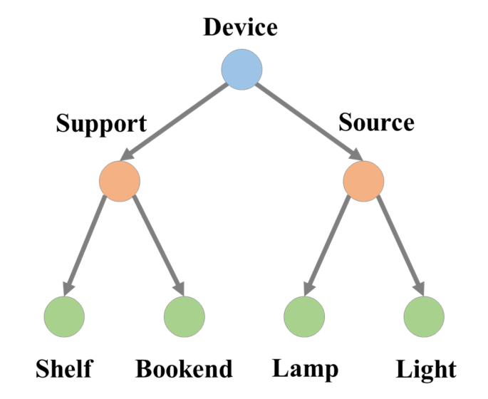 进一步,我们发现知识图谱中的语义分层现象可以抽象为树型 (Tree) 结构。其中: