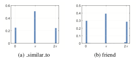 从图中可以看到,它们每一维度的取值主要集中于三个值附近:0、π 与 2π,并且取值接近 π 的维度占比为 40%-50%。也就是说,这些头尾实体中接近一半的维度取值都相差 π。因此位于同一语义层级的实体可以被角度部分区分。