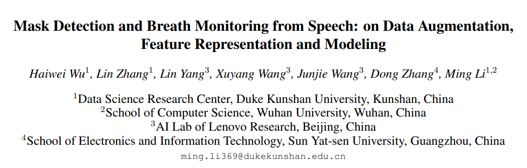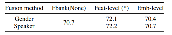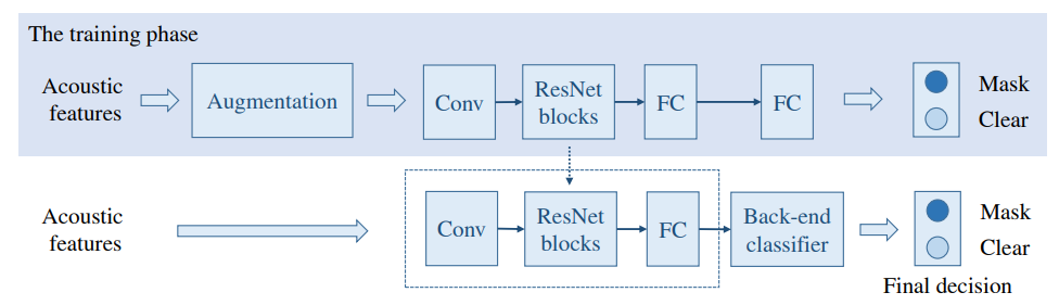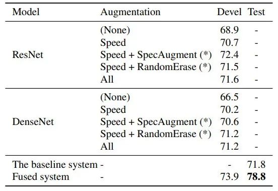 对于口罩检测任务,研究人员实现了两种卷积神经网络系统,即ResNet和DenseNet,以提取高级嵌入,然后在这些嵌入上采用SVM进行决策。研究人员还利用三种数据增强方法,这些方法在端到端框架中实现了重大改进。受到在情感识别方面的工作的启发,研究人员从基于ResNet的预训练性别分类器中自动提取了性别相关特征。这些特征来自使用Voxceleb1数据集训练的性别分类器网络的倒数第二个线性层。ResNet结构几乎与论文《On-the-fly data loader and utterance-level aggregation for speaker and language recognition》中描述的相同,不同之处在于倒数第二线性层的输出节点数为100。为了引入说话者的信息,研究人员按照上述论文的配置训练模型并提取嵌入作为说话者相关特征。在口罩检测器的优化过程中,这两种特征会在不同级别上融合。表1展示了性别特征融合方法与说话者特征融合方法对口罩检测的贡献。融合了这两种特征的口罩检测性能要比其他特征好得多,这表明这两种信息对于口罩检测都是有效的。也就是说,戴口罩可能给说话者语音的性别特征和身份特征带来较大的影响。表1:开发集上利用融合性别和说话者特征的口罩检测UAR(%,未加权平均召回率)。在表2中可以看到,与基于DenseNet的系统相比,基于ResNet的系统实现了更好的性能。三种数据增强方法均有助于显著提高性能。与对开发集进行随机擦除相比,SpecAugment方法可实现更大的性能提高。将SpecAugment和随机擦除相结合没有带来改进,这意味着SpecAugment和随机擦除的效果不是互补的。该团队最终提交的系统是将表1和2中标有(*)的系统融合在一起得到的,其性能大大优于测试集上的基准系统。 表2:开发集和测试集上的UAR。 3 模型和方法