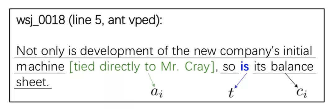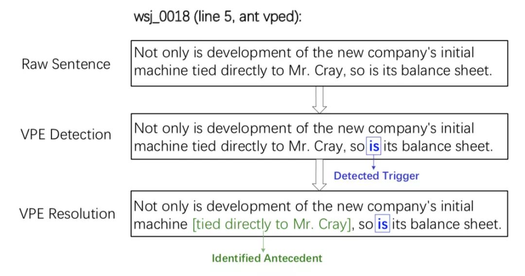 图 1. 一个动词短语省略恢复过程的例子,其中”is“是 VPE 的触发词,括号中的 VP “tied directly to Mr. Cray” 是 VPE 的先行短语。