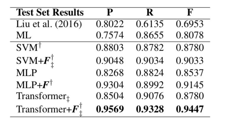 除了表 1 中提出的特征之外,为了进行实证比较,我们还整合了 [14] (ML) 提出的特征,用 F 表示。通过集成 ML 模型使用的特征来改进 SVM 和 Transformer 模型, 我们可以看到两者的表现。我们得出结论: