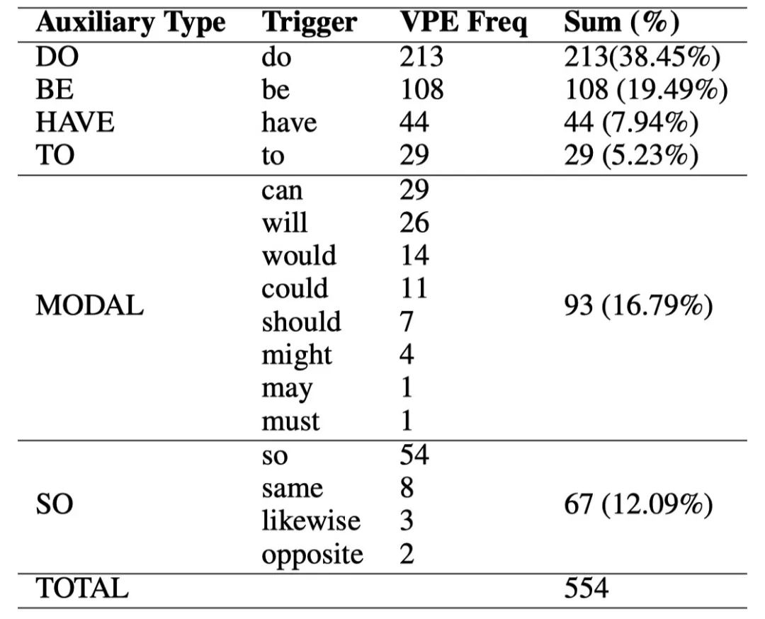 表 2. 实验数据集中助动词和相应触发词和 VPE 的统计。 Auxiliary, Trigger 和 VPE Freq 分别表示助动词类型,触发词和 VPE 频率