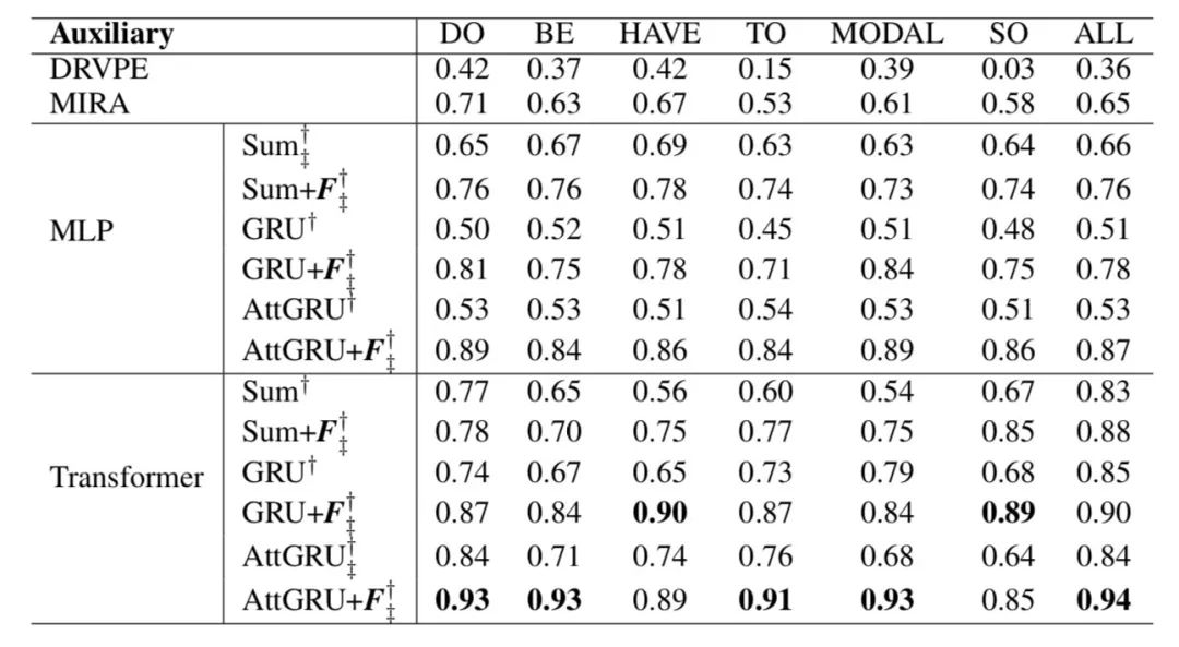 表 5. 通过 5 折交叉验证获得的 VPE 消解结果。 这里,DRVPE 和 MIRA 是两个基线。 Sum,GRU 和 AttGRU 分别表示三种编码机制,即 sum-pooling,GRU 和基于注意力的 GRU。 Sum + F,GRU + F 和 AttGRU + F 分别代表具有手动构造特征的三种编码机制。 †和‡表示性能在 DRVPE 和 MIRA 的基线上分别有显著性提升,p <0.05。 粗体结果表示最佳性能。