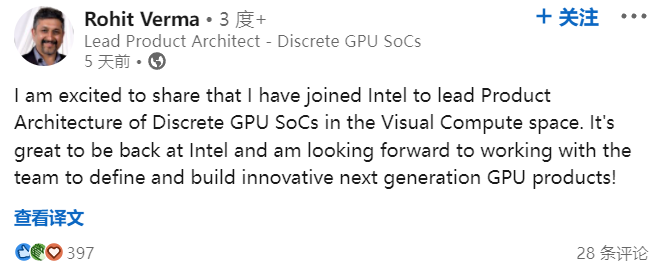 在Linkedin上,Rohit Verma也发消息称,对自己重返英特尔感到兴奋。