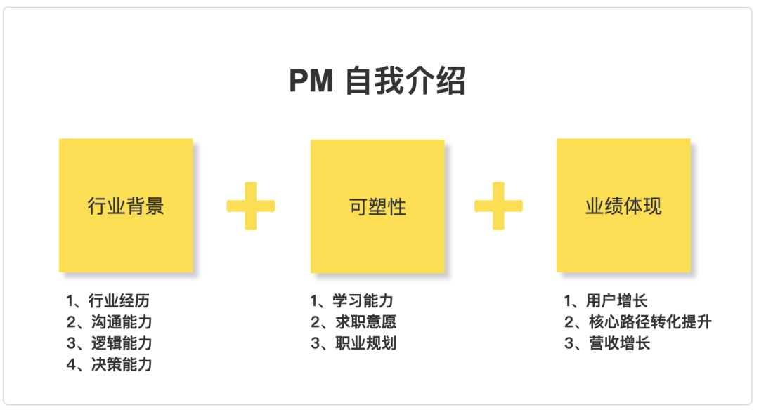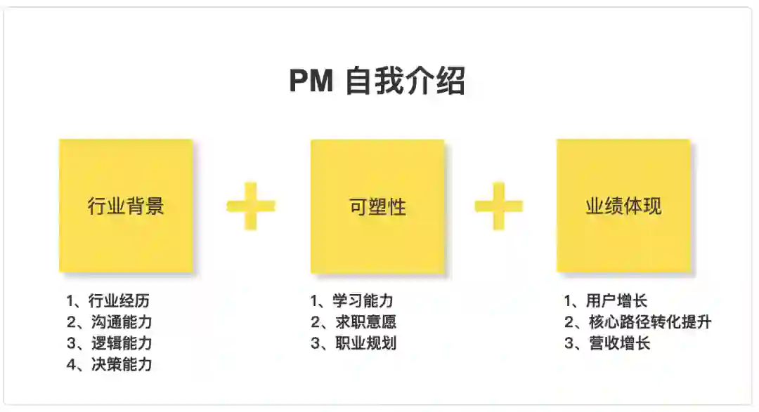 至此,结合面试官要求自我介绍的“核心需求”和“核心目的”,我们可以发现优秀的自我介绍重点分为这三部分:行业背景+可塑性+业绩体现。如果你缺失以上部分,记得按照这套公式,完善出一份高分自我介绍哦~