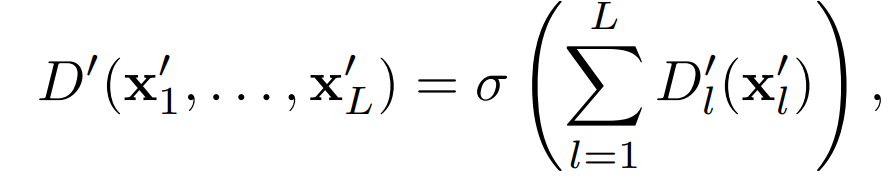 为了训练上述由多个子生成器组成的生成器,需要一个鉴别器为它们生成的视频集评估一个分数。鉴别器由多个子鉴别器组成。D’_l表征第l个子鉴别器,从第l个子生成器G’_l中获取样本x’_l并返回一个标量值。鉴别器D’利用以下公式对一组x’_l进行评分