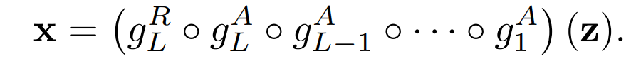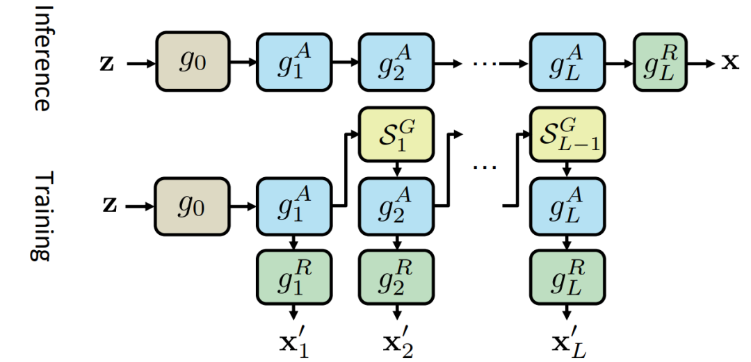 给定L个子生成器,或L个抽象块组成的模型。在训练的时候,这个架构是用L个相应的渲染块和L-1个子采样层来训练的。推理阶段,可以简单地通过连续应用抽象块来评估x: