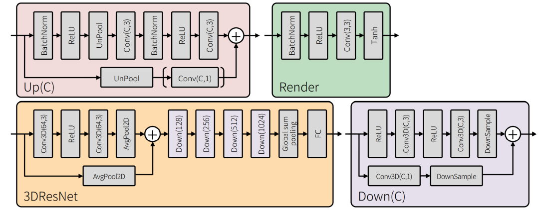 图4. 论文中使用的块细节。"Conv(C, k) "表示具有C通道和(k×k)内核的二维卷积层。"Conv3D(C, k) "表示具有C通道和(k×k×k)核的三维卷积层。"UnPool "表示一个具有(2×2)核和stride为2的二维 unpooling layer 。"AvgPool2D "表示沿空间维度的二维平均池化层,核为(2×2),stride为2。请注意,它并不沿时间维度进行池化操作。"DownSample "表示下采样操作。如果输入的三维特征图的每个维度的大小都大于1,该操作符就会沿着其轴线进行平均池化操作(如果在进行平均池化操作时大小为奇数,则目标轴的padding被设置为1)。否则,不对该轴进行 average pooling 。Up(C) "中的(-)表示,如果输入通道的数量与输出通道的数量相等,则不插入括号内的块