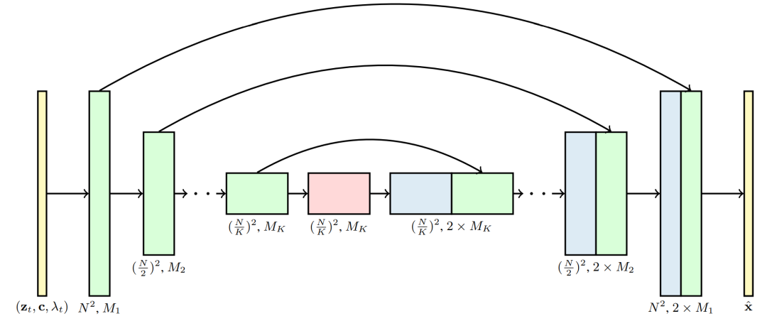 图24. 扩散模型中xˆθ的三维U-Net结构。每个区块代表一个4D张量,其轴标记为帧×高×宽×通道,以时空因子的方式处理。输入为噪声视频z_t、调节c和log SNR λ_t。下采样/上采样块通过每个K块调整空间输入分辨率的高度×宽度,系数为2。通道数用通道乘法器M1、M2、...、MK指定,上采样通道与下采样通道有skip connections连接