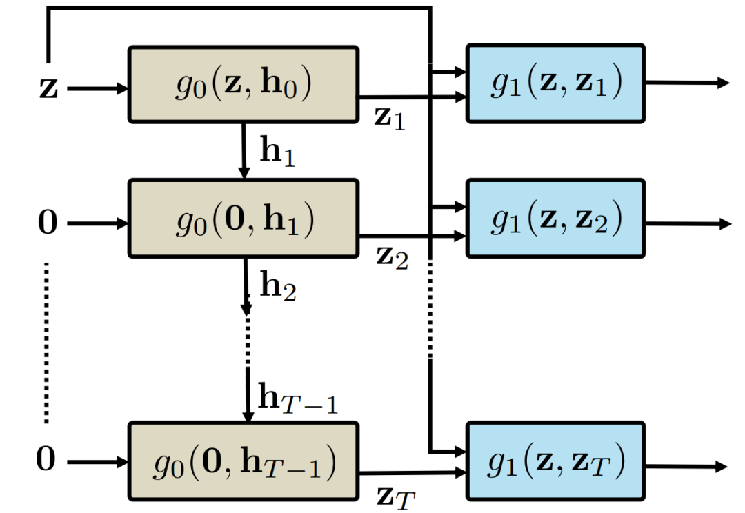 图2. 经典temporal GAN中使用的时态生成器和图像生成器之间的关系概述。为了生成一组T个潜在向量,时间生成器通常是一个递归网络