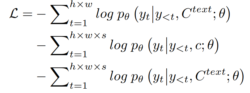 在三个任务上训练模型时(文本到图像( Text-to-Image,T2I)、视频预测( Video Prediction ,V2V)和文本到视频( Text-t,o-Video T2V)),训练目标为交叉熵函数,分别表示为三个部分: