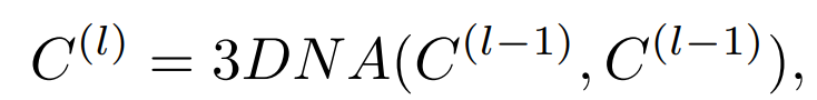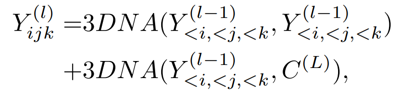 然后,将条件送入一个由L个3DNA层堆叠而成的编码器,以模拟自注意力的相互作用,其中第l层为: