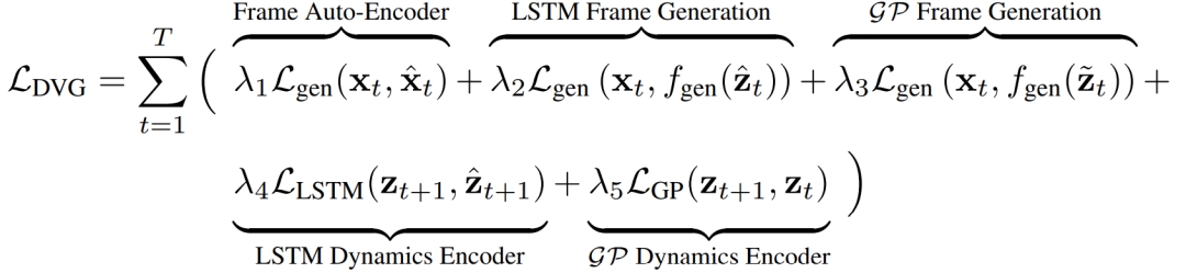 所有三个模块,帧自动编码器、LSTM及GP时间编码器,是使用以下目标函数联合训练的: