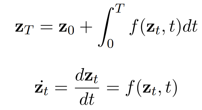 可以用微分方程( Ordinary Differential Equations , ODEs)代替自动回归的LSTM或1D核来模拟潜在变量z_t的演变。通过学习函数f(z_t),可以通过积分找到未来的z_T: