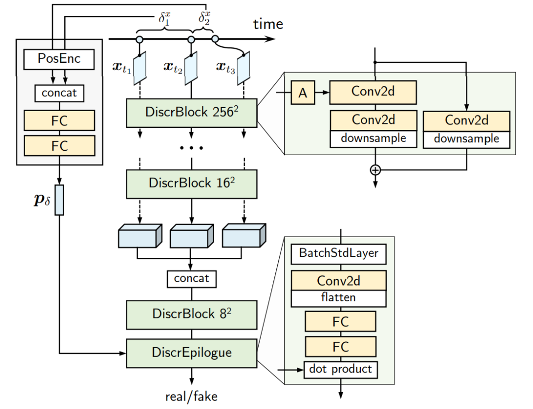 图13. 每段视频k=3帧的鉴别器结构。在StyleGAN2鉴别器的基础上所做的唯一变化是在16个分辨率下串联激活通道,并在帧间时间距离的位置嵌入上调节模型