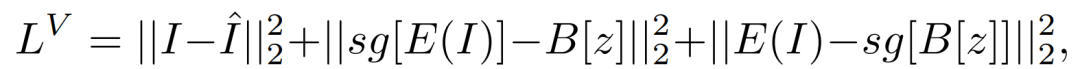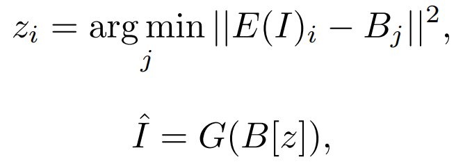 其中,E为编码器。搜索到的结果z∈{0, 1, . . . , N - 1}_h×w被B嵌入,并由解码器G重构回Iˆ。VQ-VAE的训练损失函数为