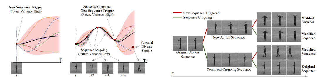 DVG利用GP在任何特定时间步长的方差作为行动序列是否正在进行或结束的指标,具体如图9,当观察到一帧(例如在时间t)可能有几种可能的未来时,GP模型的方差很高(图9(左))。不同的函数表征可以生成的潜在行动序列,从这个特定的框架开始。一旦选择了下一帧(t+2),未来状态的GP方差相对较低(图9(中)),表明一个行动序列正在进行中,模型应该继续它,而不是试图对一个不同的样本进行采样。在正在进行的序列完成后,对潜在的未来状态的GP方差又变得很高。这意味着我们可以继续这一行动。以上过程简要说明了我们如何使用GP来决定何时触发不同的行动。图9(右)显示了一个使用GP触发器的例子,每隔几帧就触发一个不同的动作。
