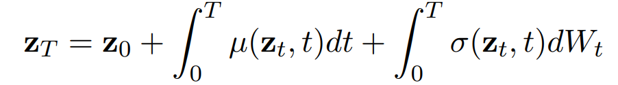 ODE允许在确定的系统中进行路径近似。每个z_t都会产生一个z_t+1,但这并不反映视频的真正功能。SDEs可能是表征视频中存在的随机性的一个好方法,它提供了ODEs的所有好处,同时允许随机性与它们的附加噪声。令μ(z_t)和σ(z_t)分别代表漂移和扩散,我们发现z_T有: