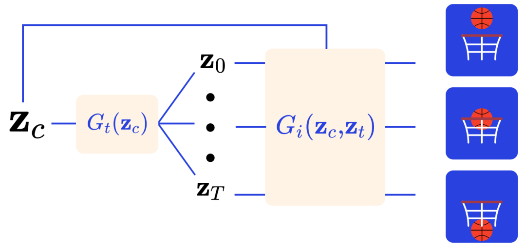 图5. G_t将潜在变量z_c转换为一系列的temporal vectors z0, z1, ..., zT。每个z_t与z_c串联并转化为一个图像。上述图像被连接起来组成一个视频