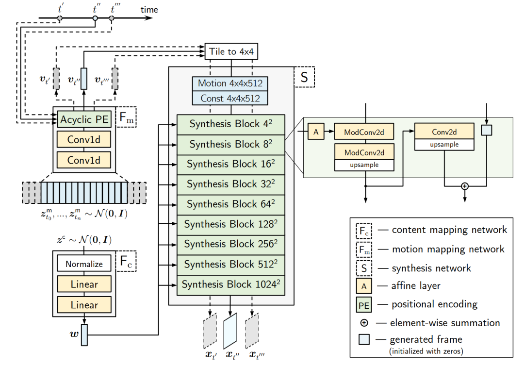 图12. 生成器架构:在StyleGAN2生成器的合成网络S之上所做的唯一修改是将运动编码与常量输入张量相连接。S使用内容编码w和运动编码v_t生成帧x_t