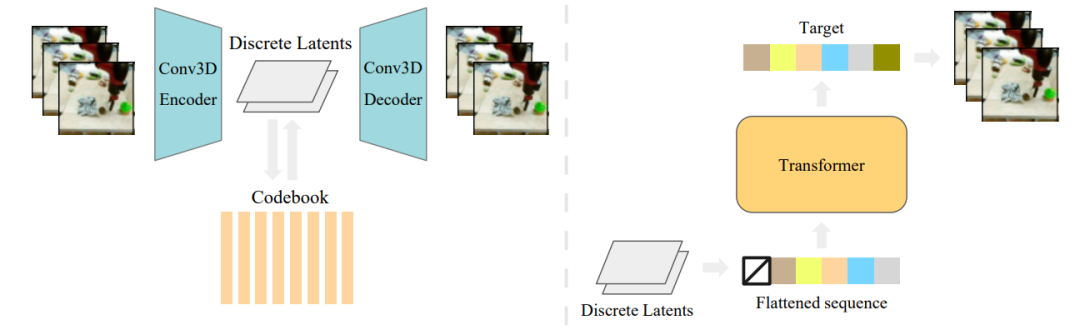 对于视频,使用二维VQ-GAN对视频的每一帧进行编码,也可以产生时间上的一致性视频,并同时受益于图像和视频数据。由此生成的表征表示为R_h×w×s×d,其中,s表示帧的数量。