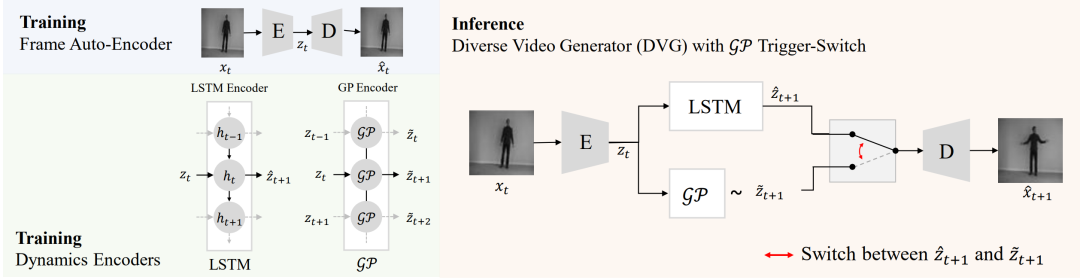 给定一组观察到的帧,目标是生成一组多样化的未来帧。DVG模型有三个模块:(a)一个帧自动编码器(或编码器生成器),(b)一个LSTM时间动态编码器,(c)一个GP时间动态编码器,用于对各种潜在的未来状态进行先验和概率建模。帧编码器将帧映射到一个潜在的空间,随后被时间动力学编码器和帧发生器利用来合成未来帧。对于推理阶段,使用所有三个模块一起生成未来帧,并使用GP作为触发器来切换到不同的未来状态。