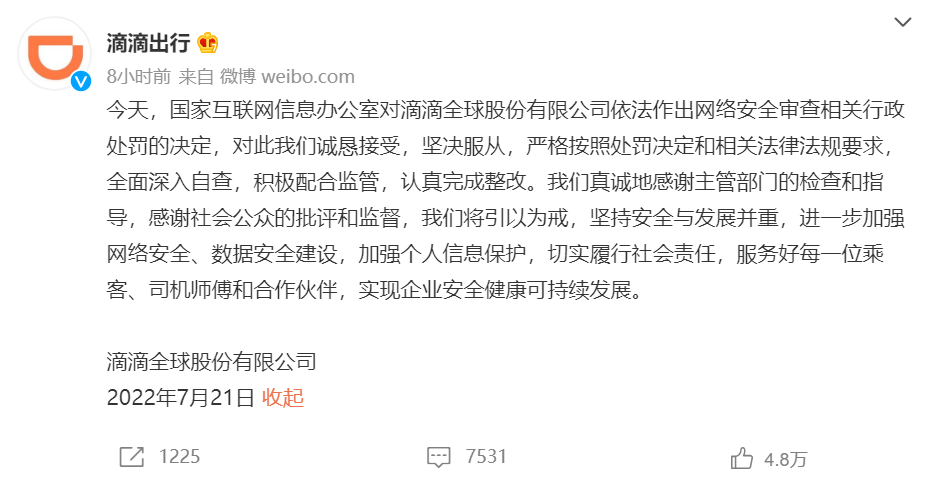 国家互联网信息办公室依据《网络安全法》《数据安全法》《个人信息保护法》《行政处罚法》等法律法规,对滴滴全球股份有限公司处人民币80.26亿元罚款,对滴滴全球股份有限公司董事长兼CEO程维、总裁柳青各处人民币100万元罚款。滴滴出行回应称,诚恳接受,坚决服从,认真完成整改。(央视新闻)