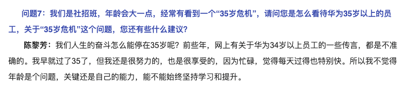 华为心声社区公开华为常务监事陈黎芳与社招新员工座谈纪要。当被问到“35岁危机”时,陈黎芳表示,前些年,网上有关于华为34岁以上员工的一些传言,都是不准确的。我不觉得年龄是个问题,关键还是自己的能力,能不能始终坚持学习和提升。(新浪科技)
