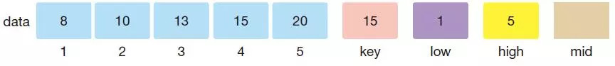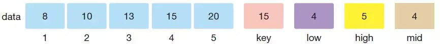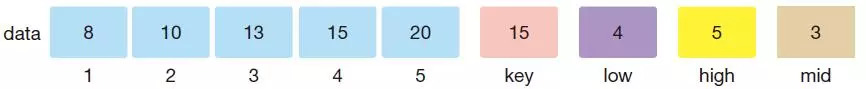 1. 将 8、10、13、15、20 添加到列表 data。 将变量 key 设为 15。分别将变量 low和 high 设为 1 和 5,low 不大于 high,因此移动到下一步。